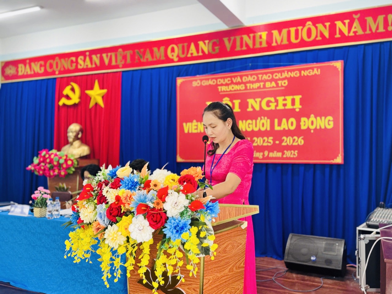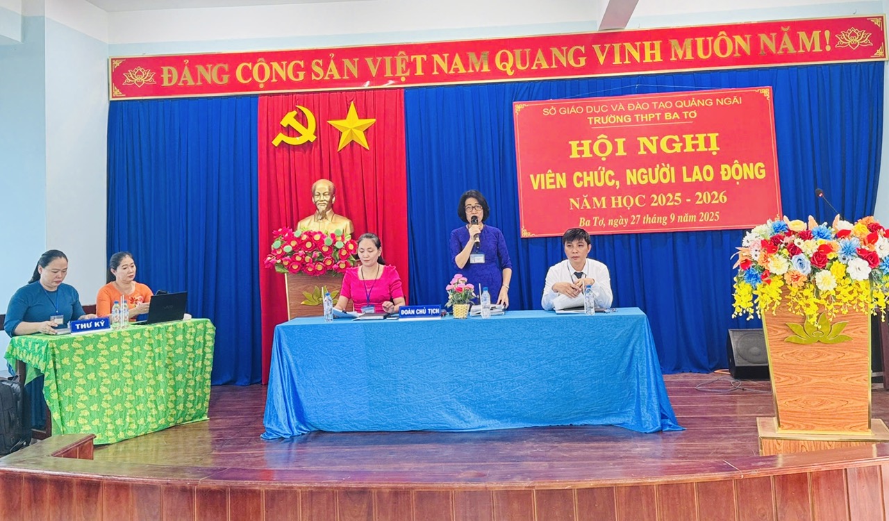 Chiều ngày 27/9, Trường THPT Ba Tơ đã tổ chức thành công Hội nghị viên chức, người lao động năm học 2025-2026, tại hội trường nhà trường. Hội nghị có Ban lãnh đạo Trường cùng toàn thể viên chức, người lao động của Nhà trường tham dự. Đây là sự kiện thường niên quan trọng, nhằm tổng kết những kết quả đạt được trong năm học vừa qua, thảo luận về các quy chế của nhà trường và đề ra phương hướng, nhiệm vụ cho năm học mới.